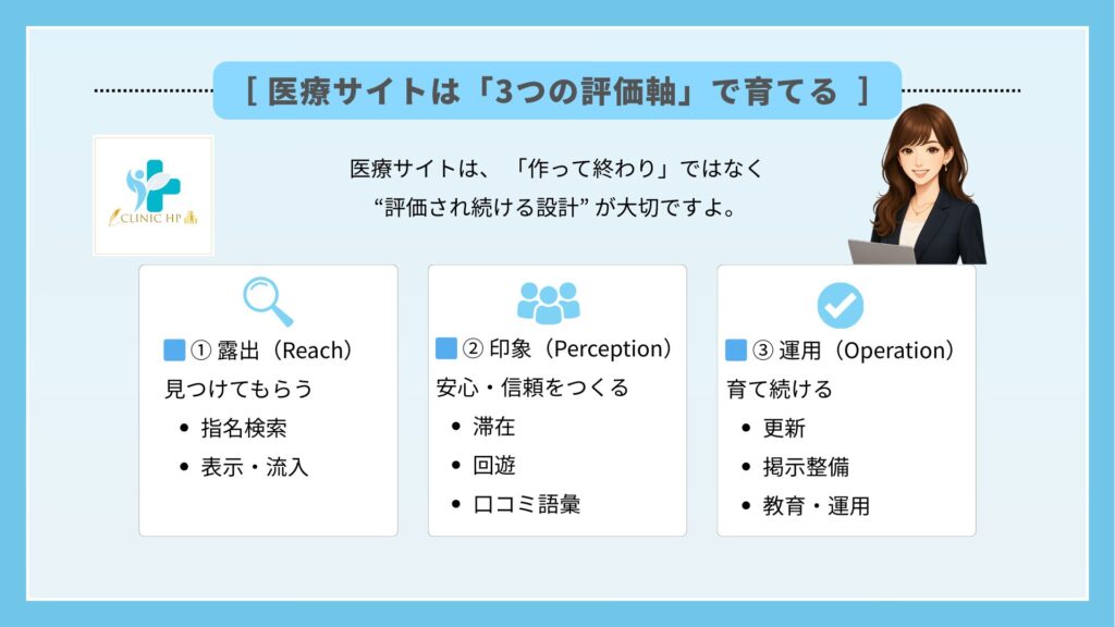 | GSC | 指名検索数/クリック率 | “医院名で探される度合い”を把握 |
